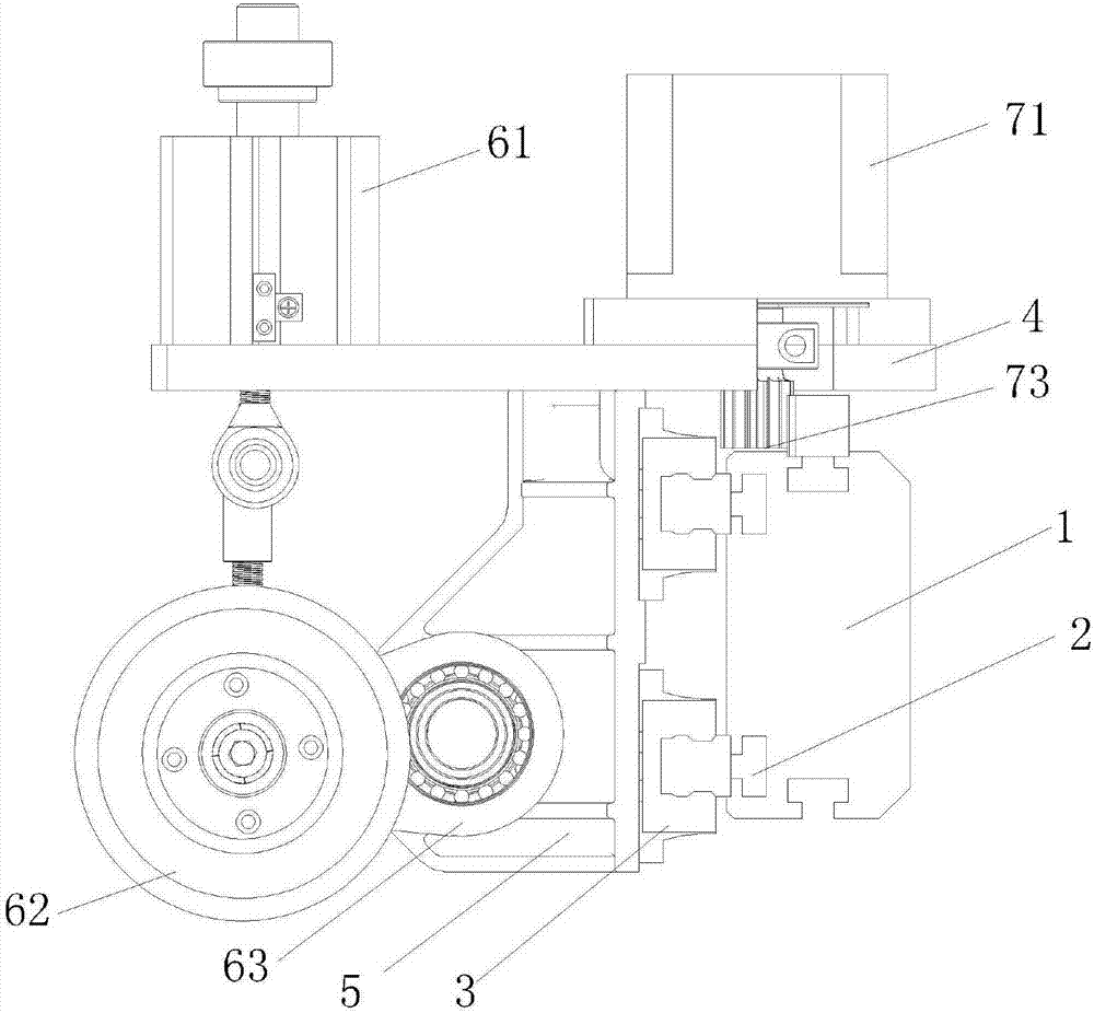如圖1~2所示,紙管機(jī)切刀62調(diào)節(jié)裝置,包括橫梁1、導(dǎo)軌2、滑塊3、橫板4、刀座5、切刀62組和驅(qū)動(dòng)切刀62組活動(dòng)的驅(qū)動(dòng)機(jī)構(gòu),所述橫梁1上設(shè)有導(dǎo)軌2,所述滑塊3與滑軌滑動(dòng)安裝,滑塊3與刀座5固定連接,所述刀座5與橫板4固定連接,切刀62組安裝在橫板4,所述驅(qū)動(dòng)機(jī)構(gòu)包括電機(jī)71、齒條72、與齒條72相嚙合的齒輪73,所述電機(jī)71與橫板4固定連接,齒條72固定設(shè)置在橫梁1,所述電機(jī)71連接齒輪73。本實(shí)施在使用時(shí),所述電機(jī)71轉(zhuǎn)動(dòng)可驅(qū)動(dòng)切刀62組移動(dòng)。
