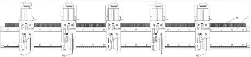 本實(shí)例的工作過(guò)程,首先確定所需紙管的長(zhǎng)度,將左端第一把切刀62調(diào)到零點(diǎn)位置,再依次調(diào)節(jié)后面的切刀62,在操作屏上輸入每把切刀62之間的距離,步進(jìn)電機(jī)71帶動(dòng)齒輪73在齒條72上沿導(dǎo)軌2左右移動(dòng),從而帶動(dòng)切刀62組移動(dòng),再通過(guò)氣缸61伸縮桿使轉(zhuǎn)動(dòng)關(guān)節(jié)63轉(zhuǎn)動(dòng),使切刀62上下擺動(dòng)從而切斷紙管。